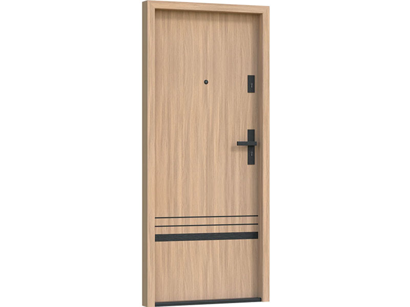 Drzwi Bastion pięknie kontrastują z drewnianą okleiną, nadając drzwiom bardzo nowoczesnego charakteru.