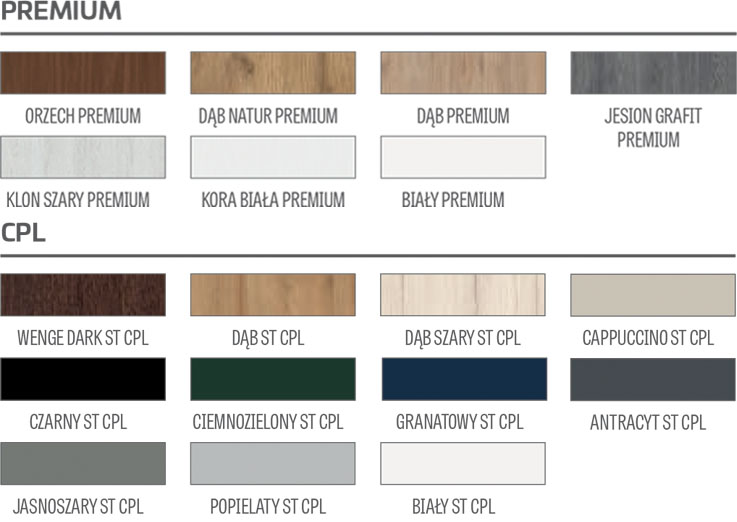 - ramiaki pionowe i poziome z płyty MDF pokryte okleiną CPL lub PREMIUM