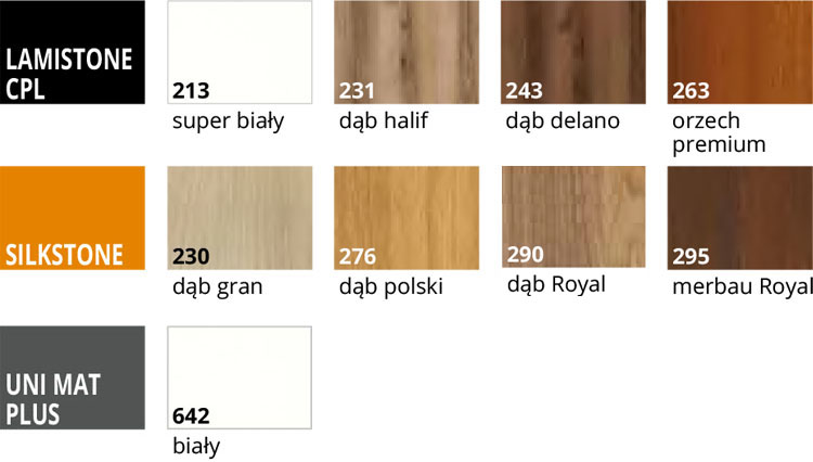 - zamek jednopunktowy, rozstaw 72 mm (sys. przylgowy) lub magnetyczny (sys. bezprzylgowy) wpuszczany, na klucz (rozstaw 90 mm), na wkładkę (rozstaw 85 mm) lub do blokady łazienkowej (rozstaw 90 mm)