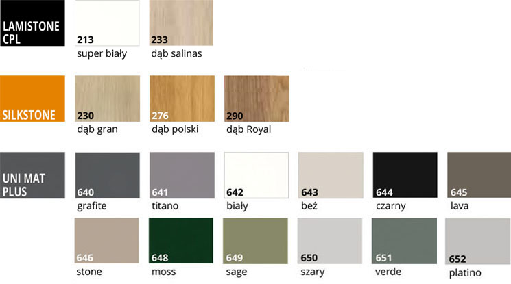 - kolor 642 biały; super biały 213 system przylgowy - zawiasy kolor srebrny; zamek w kolorze białym system bezprzylgowy - zawiasy i zamek w kolorze białym