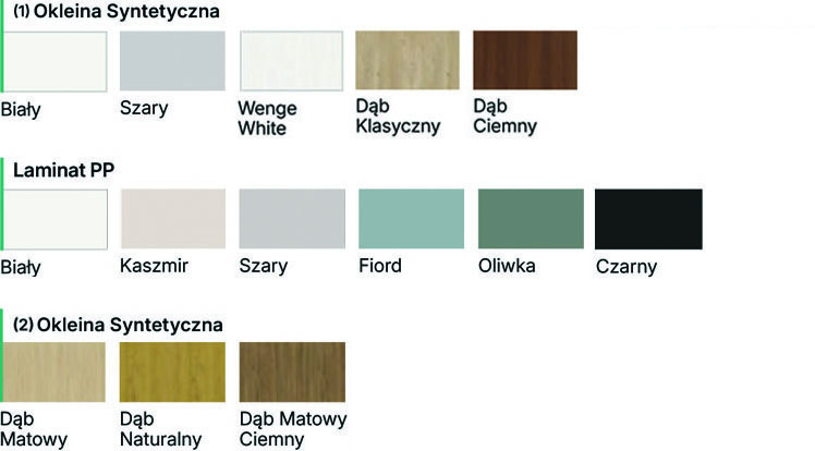 Skrzydła w zależności od wzoru składają się z ramiaków poziomych i płycin oraz szyb matowych wykonanych ze szkła hartowanego.