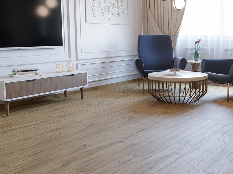 Naturalny dynamizm. Zestaw 10 różnych desek pozwala stworzyć podłogę o dynamicznym rysunku. Podłoga idealna do salonu otwartego na przedpokój, dzięki dopasowaniu do ceramiki. Wodoodporna konstrukcja umożliwia wygodne sprzątanie za pomocą mopów parowych.