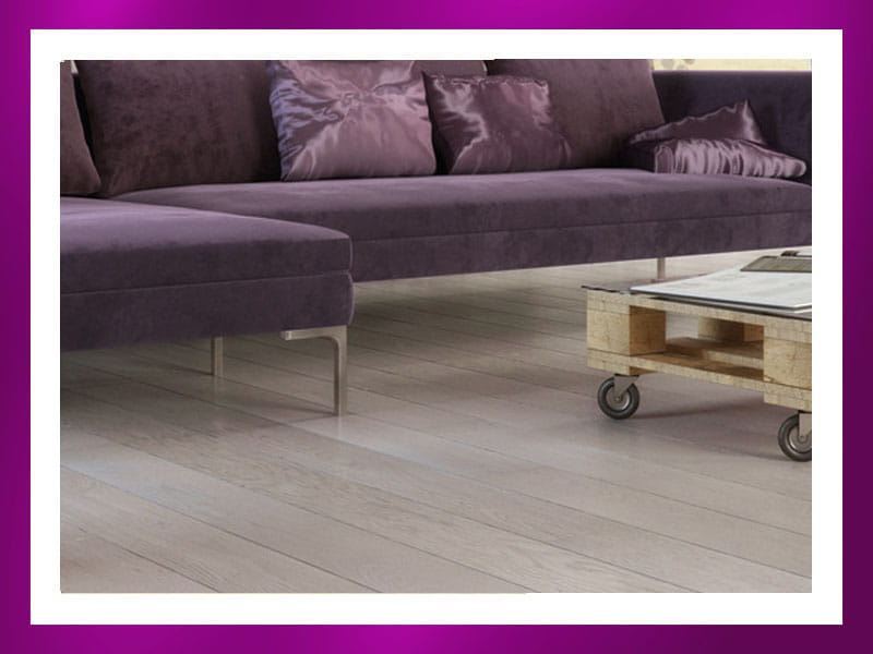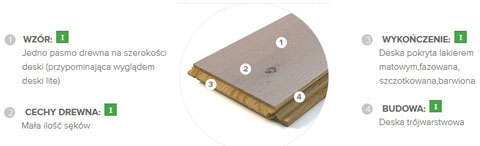Deski barwione na odcień popielu i pokryte matowym lakierem. Wyraźnie ścięte krawędzie (fazowanie) i podkreślona szczotkowaniem naturalna struktura drewna.